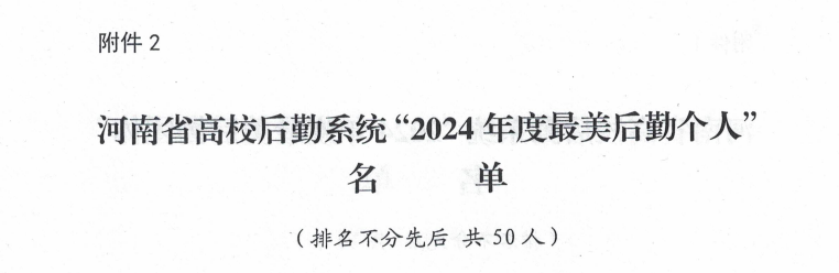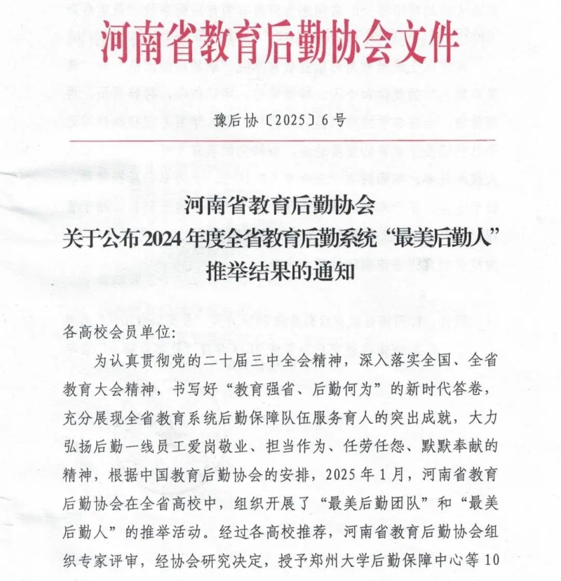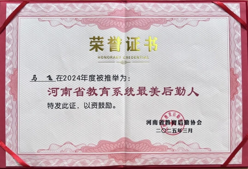 近日,河南省教育后勤协会公布了2024年度全省教育系统“最美后勤人”推举结果,我校后勤处马飞老师凭借爱岗敬业、无私奉献的精神和突出的工作表现,荣获河南省教育系统“最美后勤人”荣誉称号。
