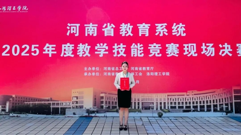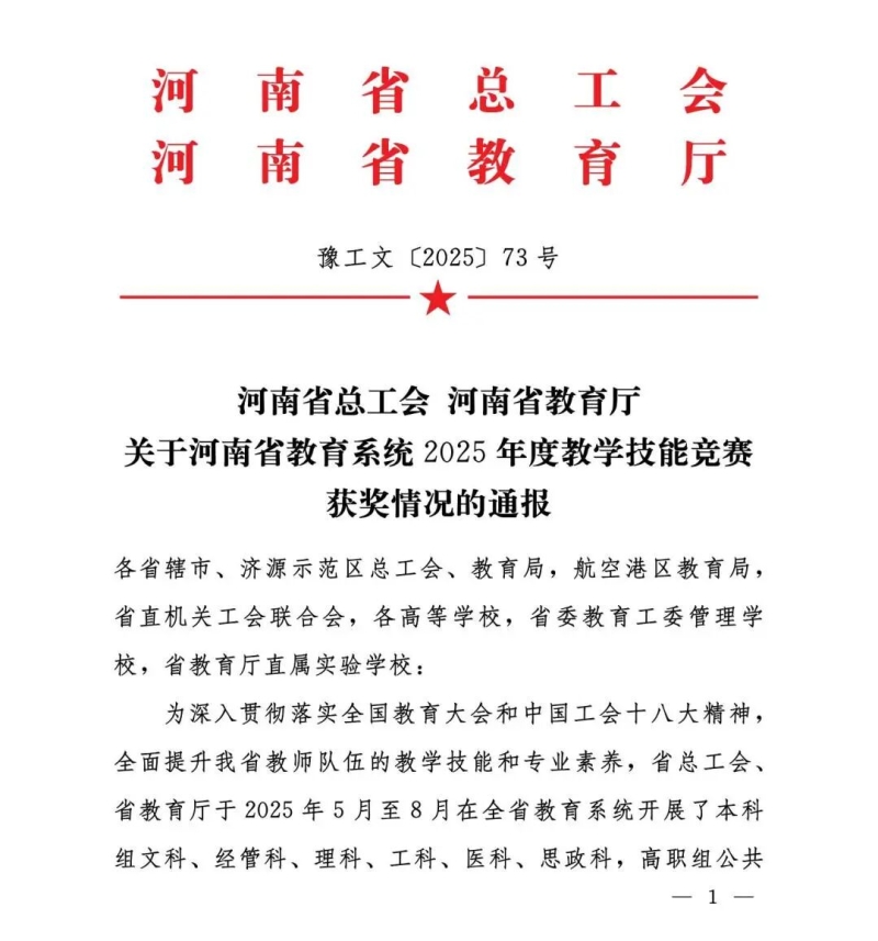 近日,河南省总工会、河南省教育厅下发《关于河南省教育系统2025年度教学技能竞赛获奖情况的通报》(豫工文〔2025〕73号),我校教师王雪歌荣获高职组公共基础一等奖,充分展现了我校教师的专业素养和教学风采。