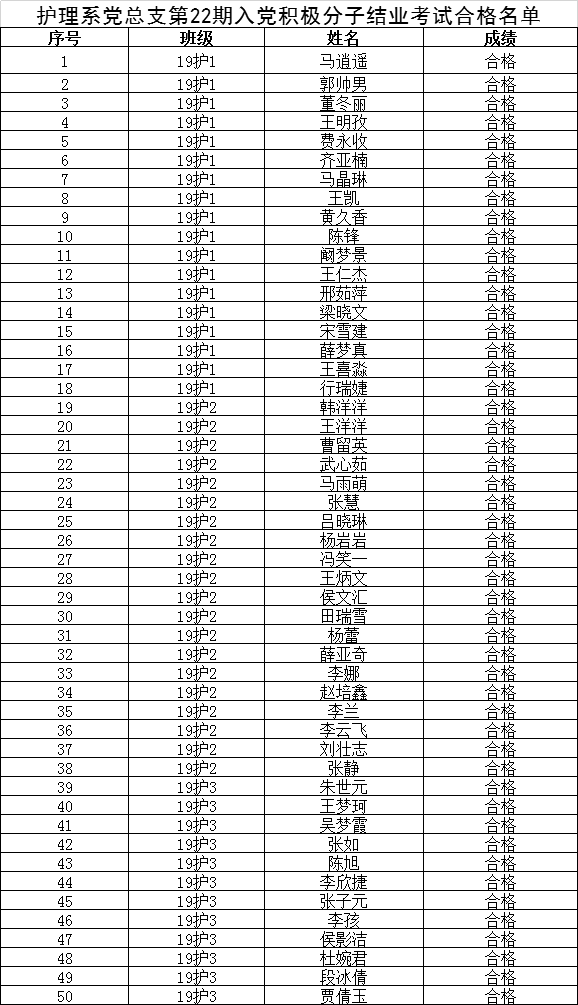 关于护理系党总支第二十二期入党积极分子结业考试成绩合格名单的公示