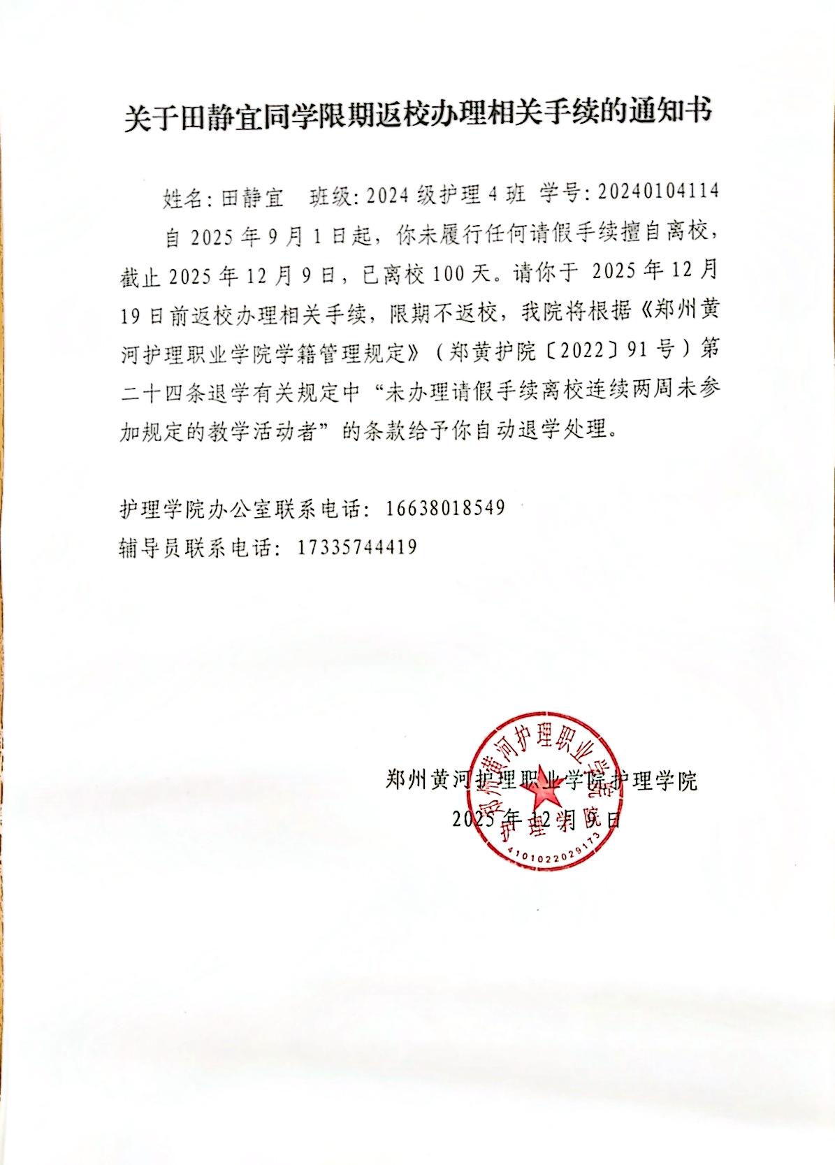 2024级护理4班田静宜,长期未返校上课,拟退学,但一直未提交退学材料,经讨论,通知学生限期返校办理相关手续。限期返校办理相关手续通知书已经通过邮政快递寄给本人,特此公示。(通知书附后)