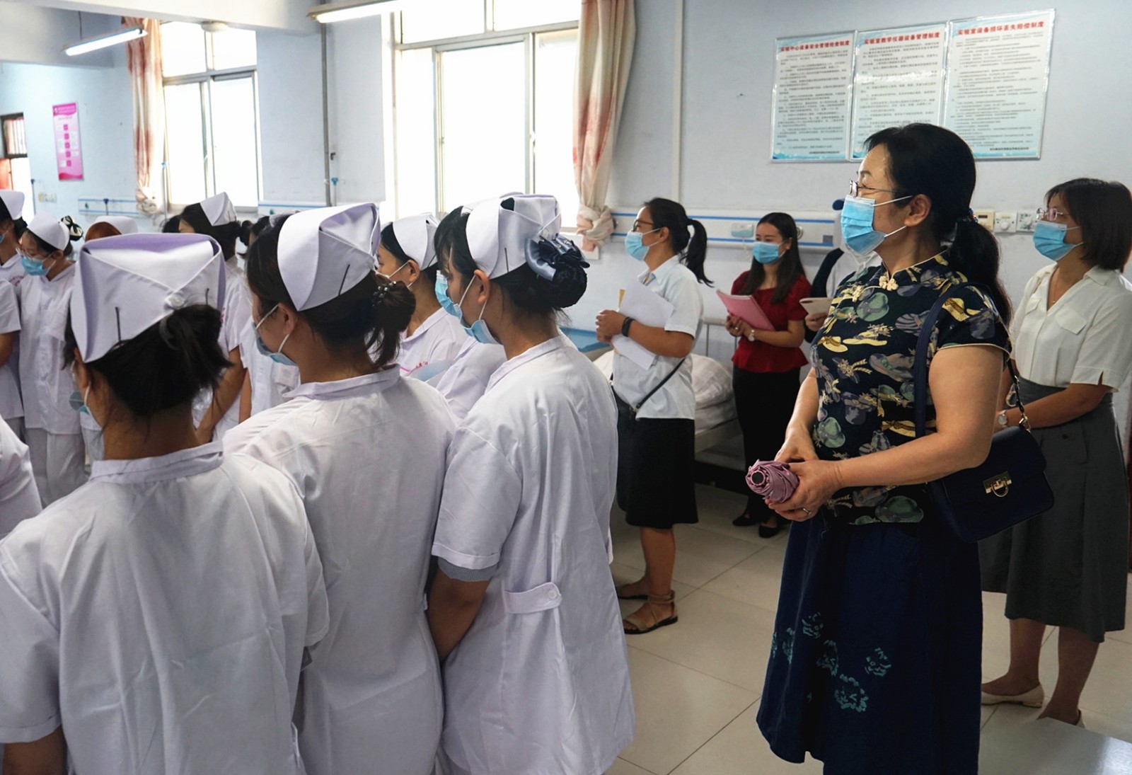 在全校师生的共同期盼中,2020-2021学年新学期到来了。为加强教学管理,规范教学秩序,9月8日上午8点,副院长张淑爱带领教务处、护理系、助产系、医学技术系、康复治疗系、基础医学部、公共教学部、思政部负责人深入教学一线,对教学区域疫情防控、教师上课、学生出勤及学习情况、实验(实训)及教学设备运行等情况进行了全面检查。