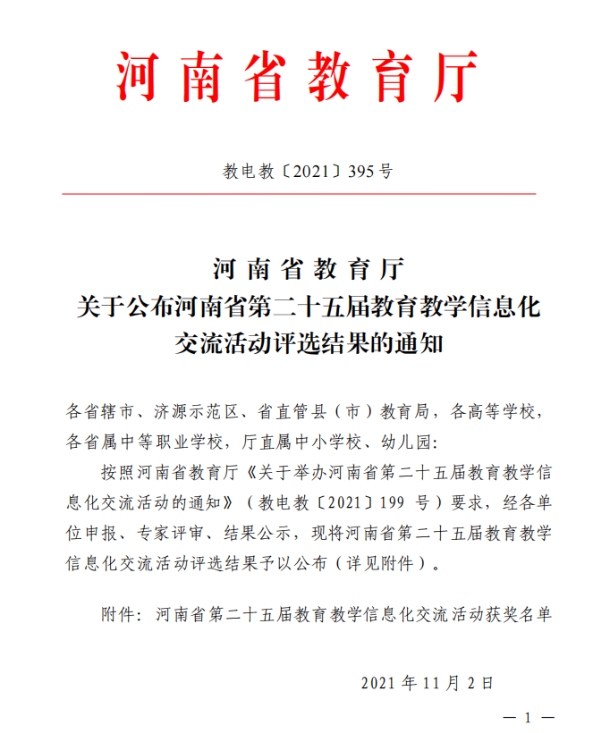 近日,河南省教育厅下发了《关于公布河南省第二十五届教育教学信息化交流活动评选结果的通知》,我校教务处共推选20件作品参赛,最终14件作品获奖。其中齐慧丽老师获得一等奖,张会想老师获得二等奖,刘梦杰、黄梦等12位老师获得三等奖。