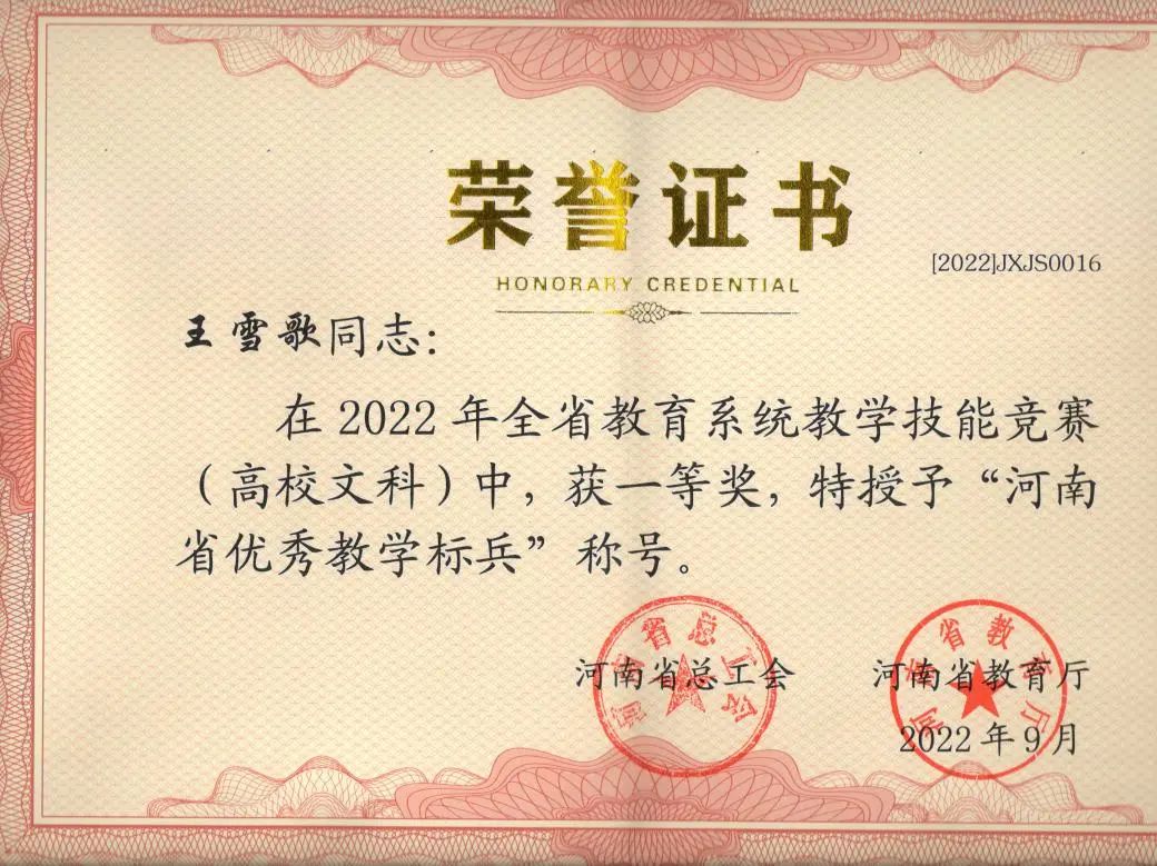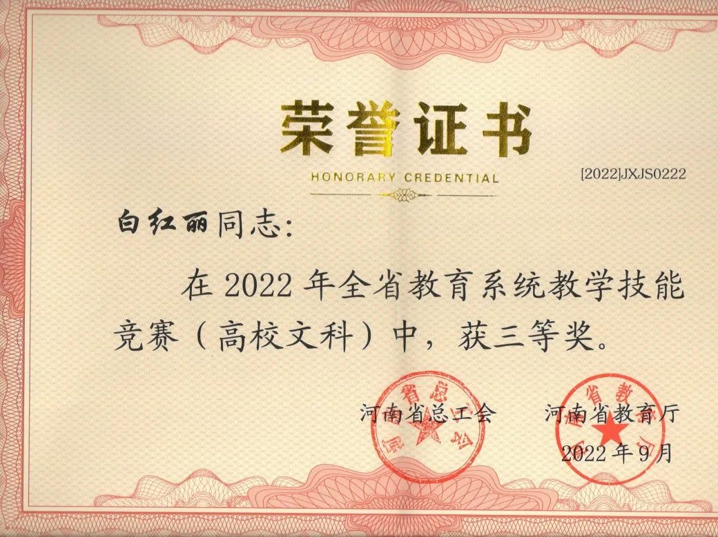 近日,河南省总工会、河南省教育厅公布了2022年全省教育系统教学技能竞赛获奖结果,我系王雪歌教师荣获一等奖,被授予“河南省优秀教学标兵”荣誉称号,白红丽教师荣获三等奖。