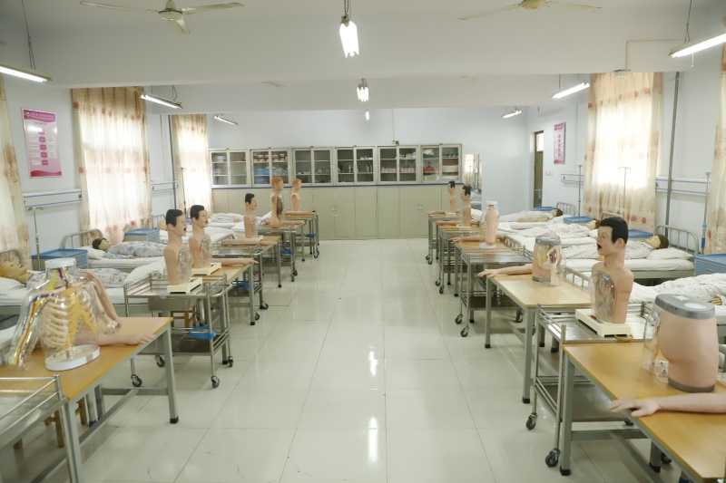 基础护理实训室,主要供护理、助产专业学生实训为主,可容纳40人左右,可以充分满足50余项护理操作练习。房间模拟医院布局,设置床旁呼叫系统、中心供氧装置,多个床单位,并配备多功能模型人和开放式教学系统,供学生仿真模拟训练。主要开设的项目有铺床法、无菌技术、口腔护理、鼻饲法、灌肠法,导尿术,以及各种注射类和静脉输液学习。