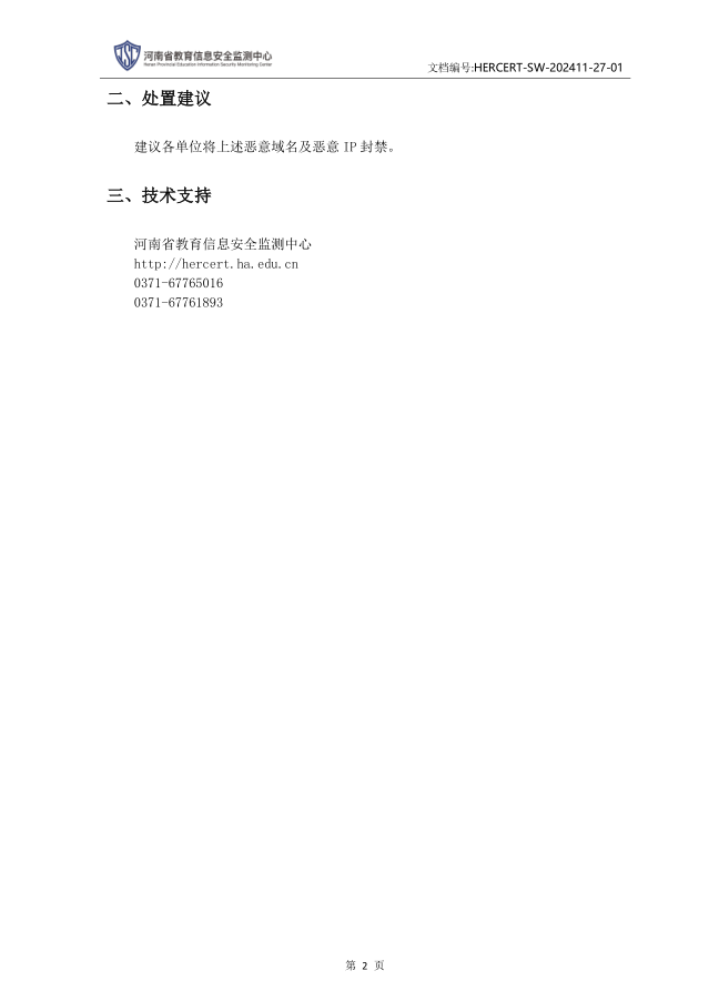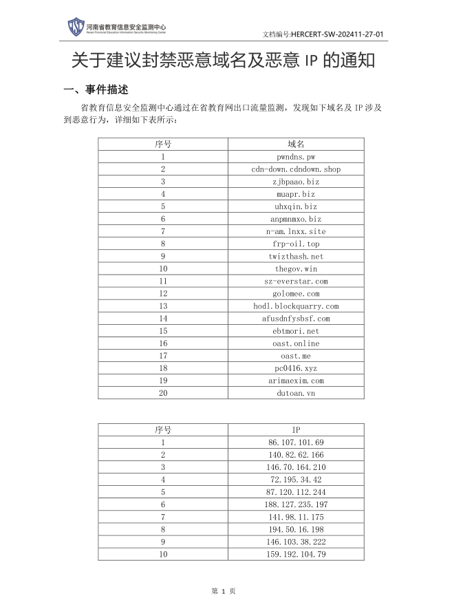 河南省教育信息安全监测中心-关于建议封禁恶意域名及恶意IP的通知