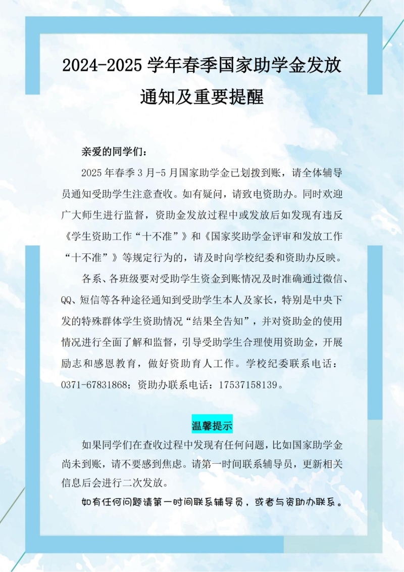 2024-2025学年春季国家助学金发放通知及重要提醒