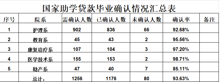 全校共有2025届助学贷款毕业生1256人(已成功还款的学生已不在确认名单中)需完成毕业确认。目前已完成确认1176人,整体完成率为93.63%。其中,护理系、教育系、康复治疗系、医学技术系4个系部完成率达90%以上,仅有一个系部未达到要求。