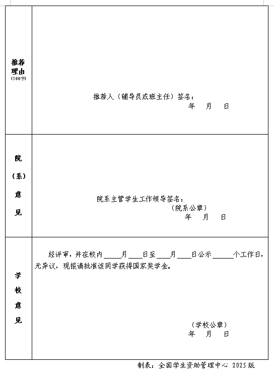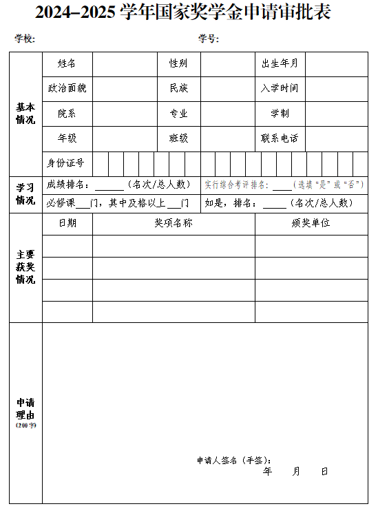 注:《国家奖学金申请审批表》(以下简称“申请表”),需双面打印、工整填写,内容须填写完整、盖章齐全,不得缺项、漏项,不得擅自更改表格格式,不得随意涂改。“学习情况”栏中,学习成绩或综合考评成绩需按班级进行排名,且不得出现并列情况;总人数和必修课门数应据实填写,不得出现同一排序标准下前后总人数不一致、必修课门次不符实际等情况。“学生获奖情况”需据实填写,注明获奖时间、所获奖项全称及颁奖单位,不得伪造虚构。表述模糊、信息不全者视为无效。“申请理由”应全面反映学生的综合素质。国家奖学金申请理由字数控制在180字左右;“推荐理由”应当简明扼要,字数控制在100字左右,达不到上述字数要求的视为无效申请。“推荐人”须是申请学生的辅导员,其他人无权推荐。表格须体现学校各级部门意见及公示时间,推荐人和学院主管学生工作的领导同志须签名,不得由其他人代写推荐意见。“学校意见”栏须加盖学校行政公章,不得以党总支或其他部门印章代替;“院(系)意见”栏须加盖院(系)行政公章。不按要求盖章视为无效申请。表中凡需签名之处,须由相关人员亲笔签写,不得以私章代替。申请表上报一律使用原件,不得使用复印件或扫描件。
