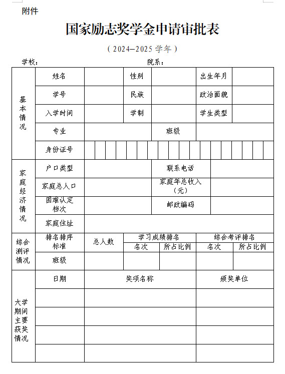注:《国家励志奖学金申请审批表》(以下简称“申请表”),需双面打印、工整填写,内容须填写完整、盖章齐全,不得缺项、漏项,不得擅自更改表格格式,不得随意涂改。“学习情况”栏中,学习成绩或综合考评成绩需按班级进行排名,且不得出现并列情况;总人数和必修课门数应据实填写,不得出现同一排序标准下前后总人数不一致、必修课门次不符实际等情况。“学生获奖情况”需据实填写,注明获奖时间、所获奖项全称及颁奖单位,不得伪造虚构。表述模糊、信息不全者视为无效。“申请理由”应全面反映学生的综合素质,国家励志奖学金申请理由字数控制在400字以上500字以内,达不到上述最低字数要求的视为无效申请。“学校意见”栏须加盖学校行政公章,不得以党总支或其他部门印章代替;“院(系)意见”栏须加盖院(系)行政公章,不按要求盖章视为无效申请。表中凡需签名之处,须由相关人员亲笔签写,不得以私章代替。申请表上报一律使用原件,不得使用复印件或扫描件。