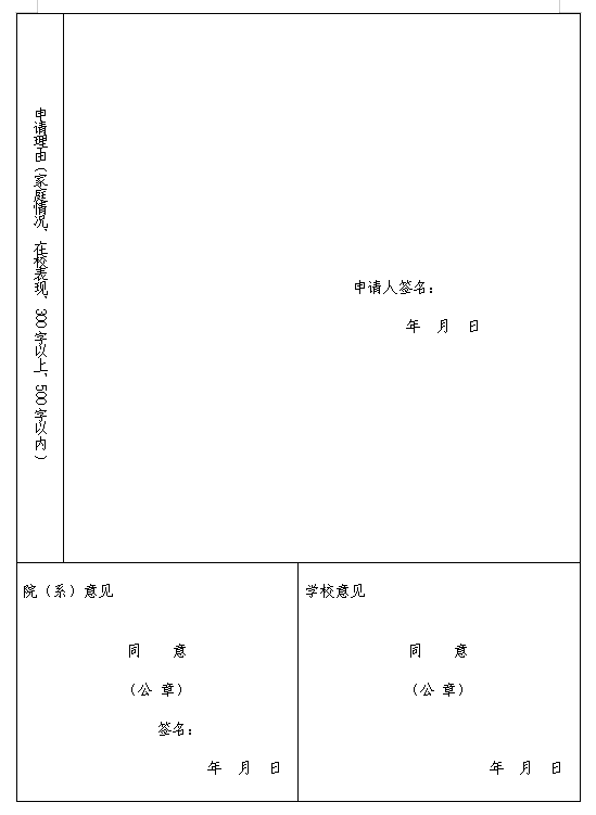 “申请理由”应全面反映学生家庭情况、在校表现,字数300字以上500字以内,达不到字数要求视为无效。