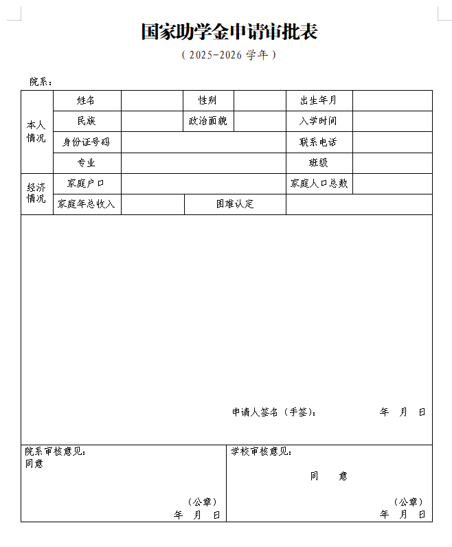 2.申请国家助学金的学生需手写《国家助学金申请书》一份。