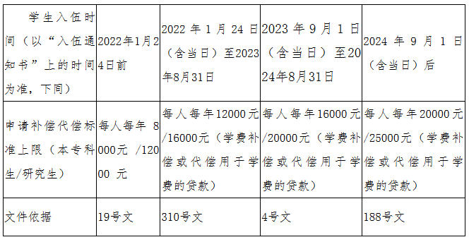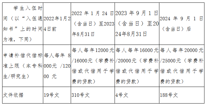 根据教育部等四部门《关于调整完善国家助学贷款有关政策的通知》(教财〔2024〕188号,以下简称“188号文”)精神,自2025年秋季学期开始,全日制本专科生学费补偿、用于学费的国家助学贷款代偿和学费减免标准最高按每生每年20000元,研究生最高按25000元执行。其他年度申请入伍学费补偿、贷款代偿、学费减免,按照当年的资助标准执行,具体执行依据为财政部、教育部、人力资源社会保障部、退役军人部、中央军委国防动员部2019年和2021年印发的《学生资助资金管理办法》(分别为“财科教〔2019〕19号”和“财教〔2021〕310号”,以下简称“19号文”和“310号文。