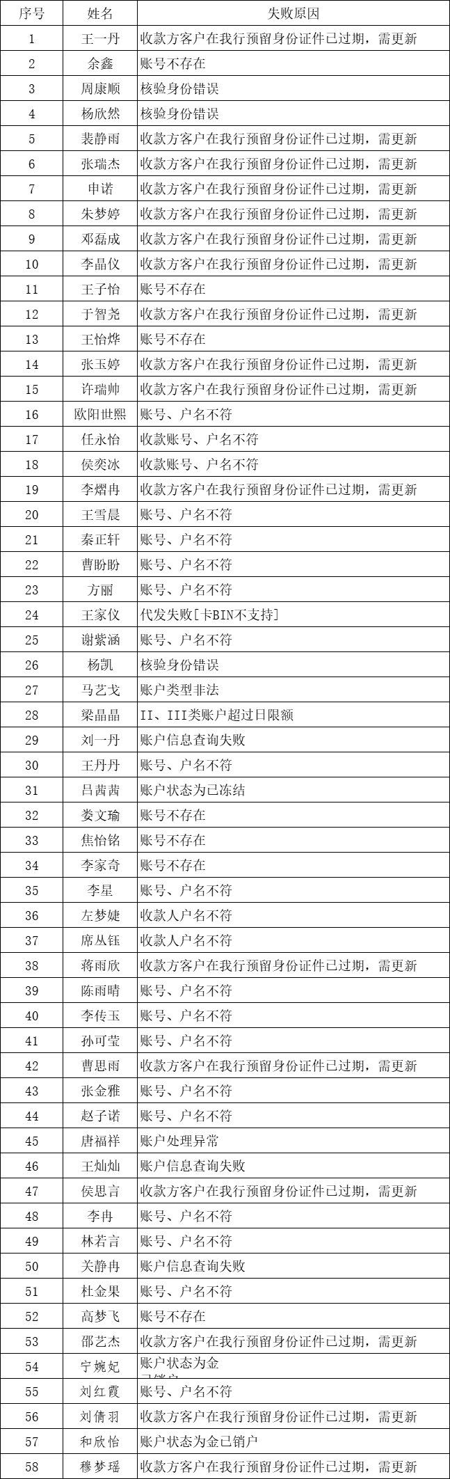 一、未发放成功学生名单及原因: